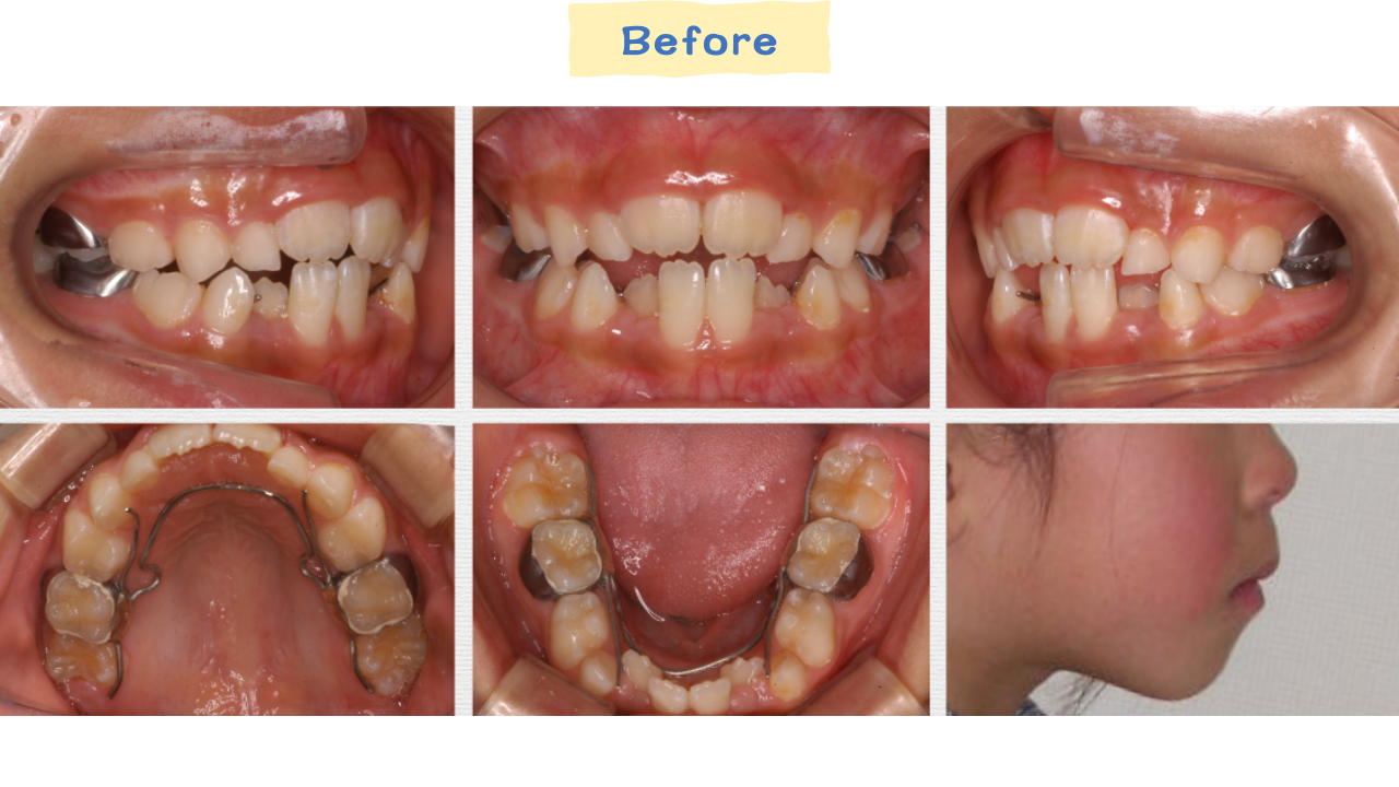 反対咬合(受け口)は、上下の前歯の噛み合わせが逆になり、下の前歯が上の前歯より前に出ている状態です。この症例では上あごの成長が弱く、下の歯が前に出ていました。
