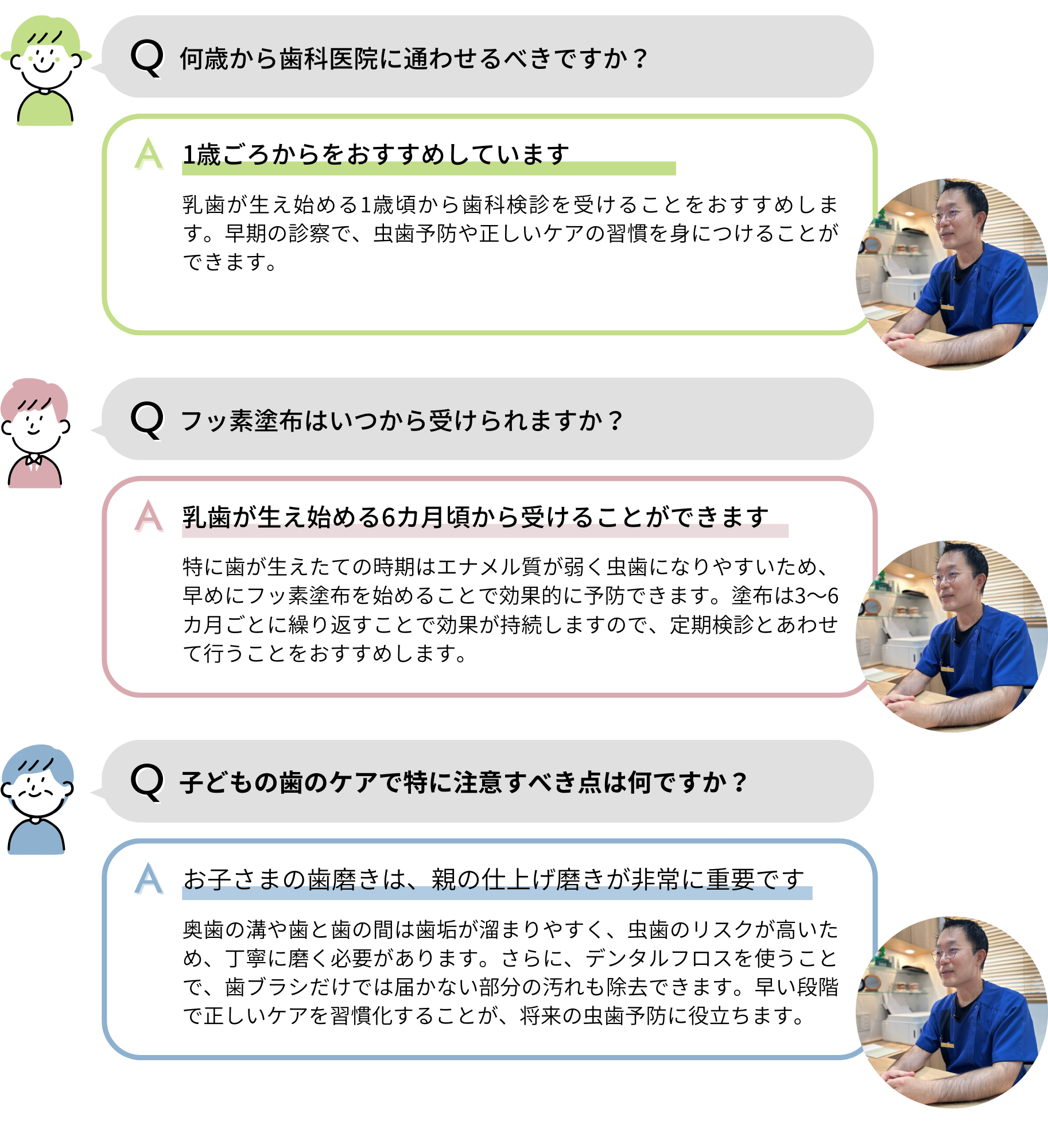 成長段階や性格に合わせた対応を心がけ、安心して通っていただける環境づくりを行っています。保護者の方と一緒に、お子さまの歯の健康を見守ります。